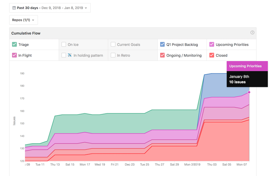Example of the states that are visualized together in a cumulative flow diagram. Using the diagram you can get an idea of how your work in progress throughput and cycle time change over time. Cumulative flow diagrams are one of the easiest ways to keep track of your projects progress to ensure that things progress smoothly.